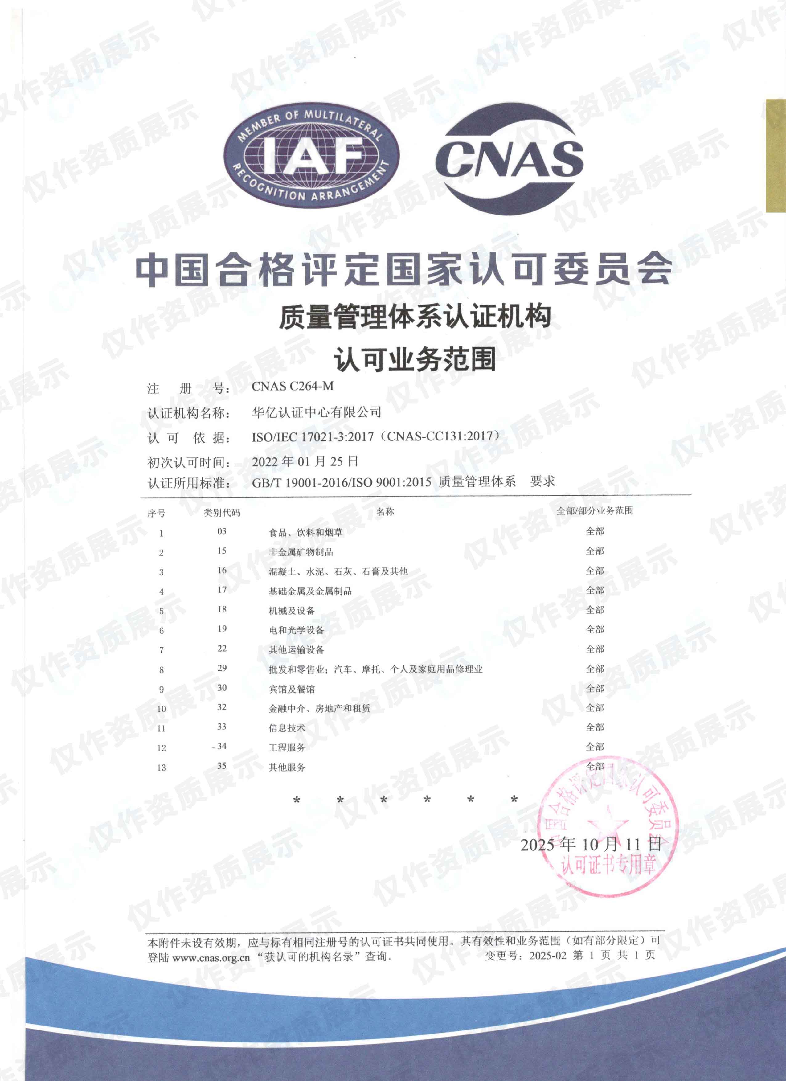 CNAS质量管理体系认证机构认可业务范围
